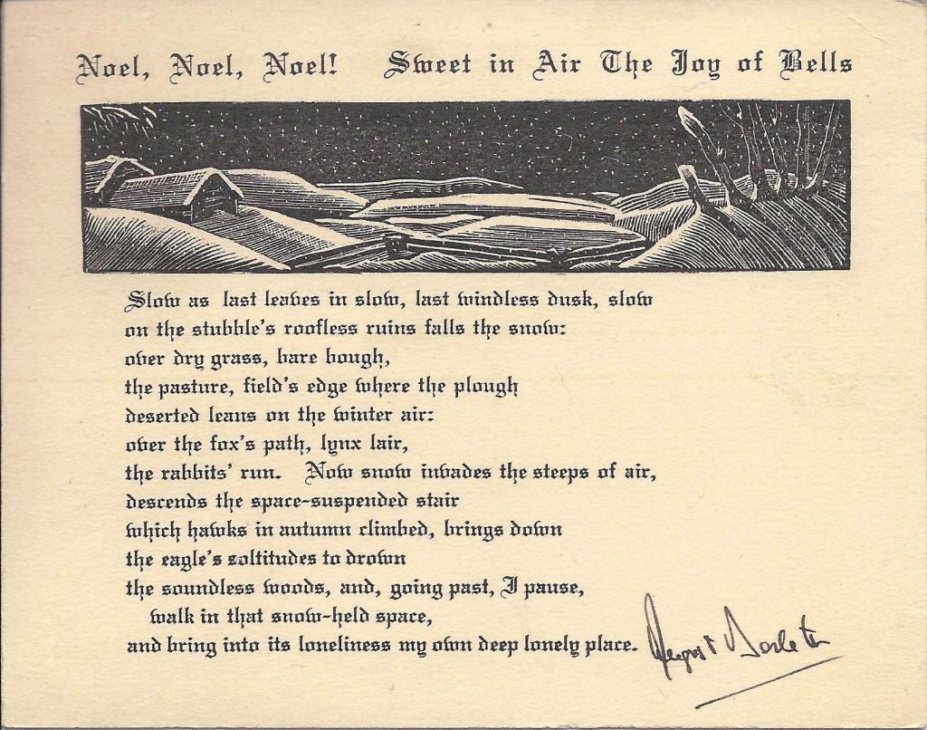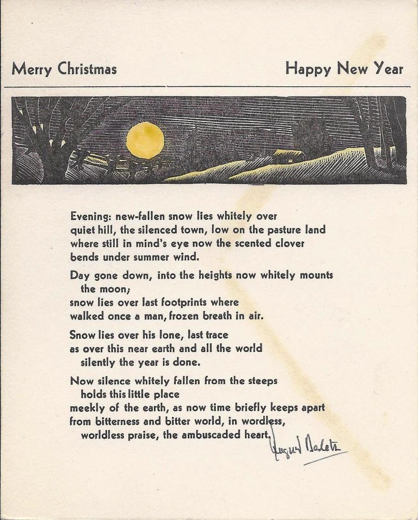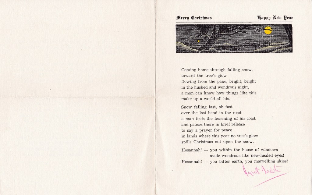 I did have offers of funding; those same generous patrons whose names had appeared on the roster of patrons for many another little review offered support. I felt I could not accept such support; I wanted the magazine to make its own way or to cease publication. I intended to keep up a relatively high average in its contents, and to that end subsequent issues featured poems by, in addition to the poets already mentioned, Wendell Anderson, Felix Pollak, William D. Barney, Gene Baro, John Beecher, Lorna Beers, Grant Code, Carleton Drewry, John Engels, James T. Farrell, Edsel Ford, James Hearst, John Judson, Raymond E. F. Larsson, David Lytle, Barriss Mills, Sydney King Russell, Arthur Sampley, Helga Sandburg, Daniel Smythe, William Stafford, Felix Stefanile, Jane Stuart, James L. Weil, Norma Farber—whose long Frostian takeoff, “Stopping by Woods on a Snowy Evening,” was, I think, the most memorable poem to appear in the magazine—and by many other poets, whose names would be almost as well known to this audience, as these.